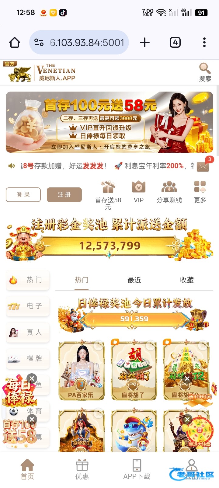 有没有那个老哥在玩图片里的这个威尼斯人进去是横屏的非常老款了以前玩了挺久的每天有免费签到有天晚上睡觉不相信睡着不相信点到了啥给手机刷机了有老哥在玩或者知道的底下评论个链接没问题的话打赏芙蓉王