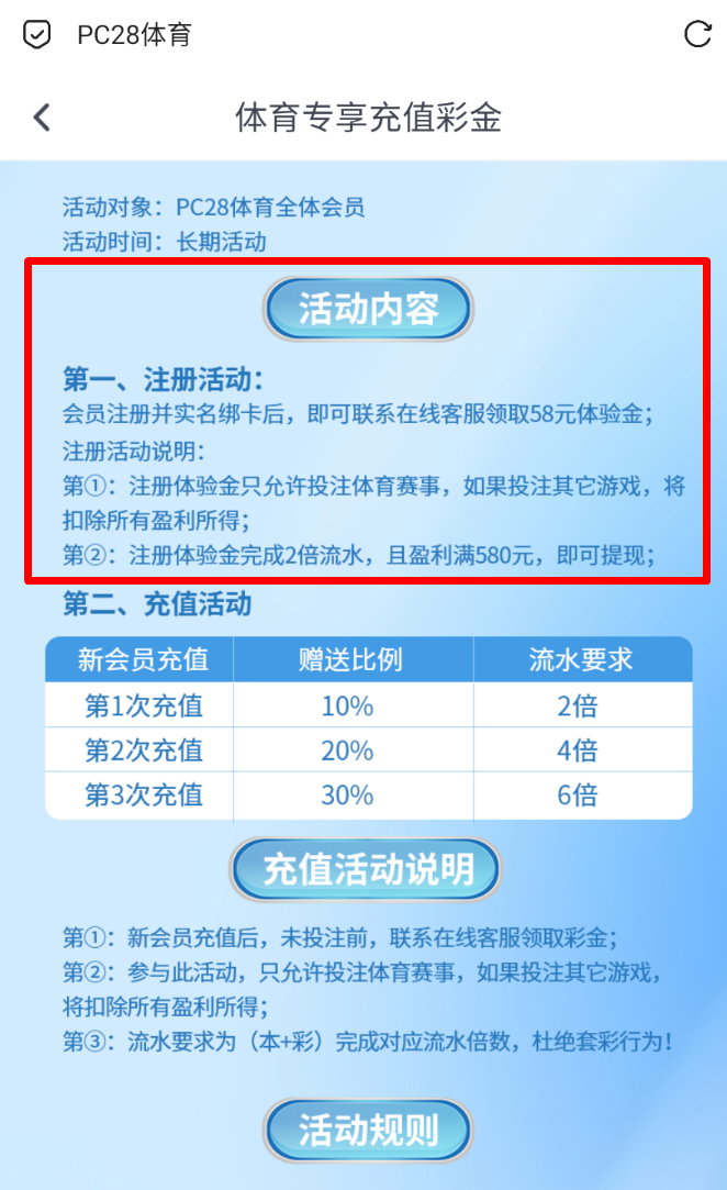 注册绑卡后联系在线客服申请 58体验金,体验金只能玩体育,出款自测 禁止充值