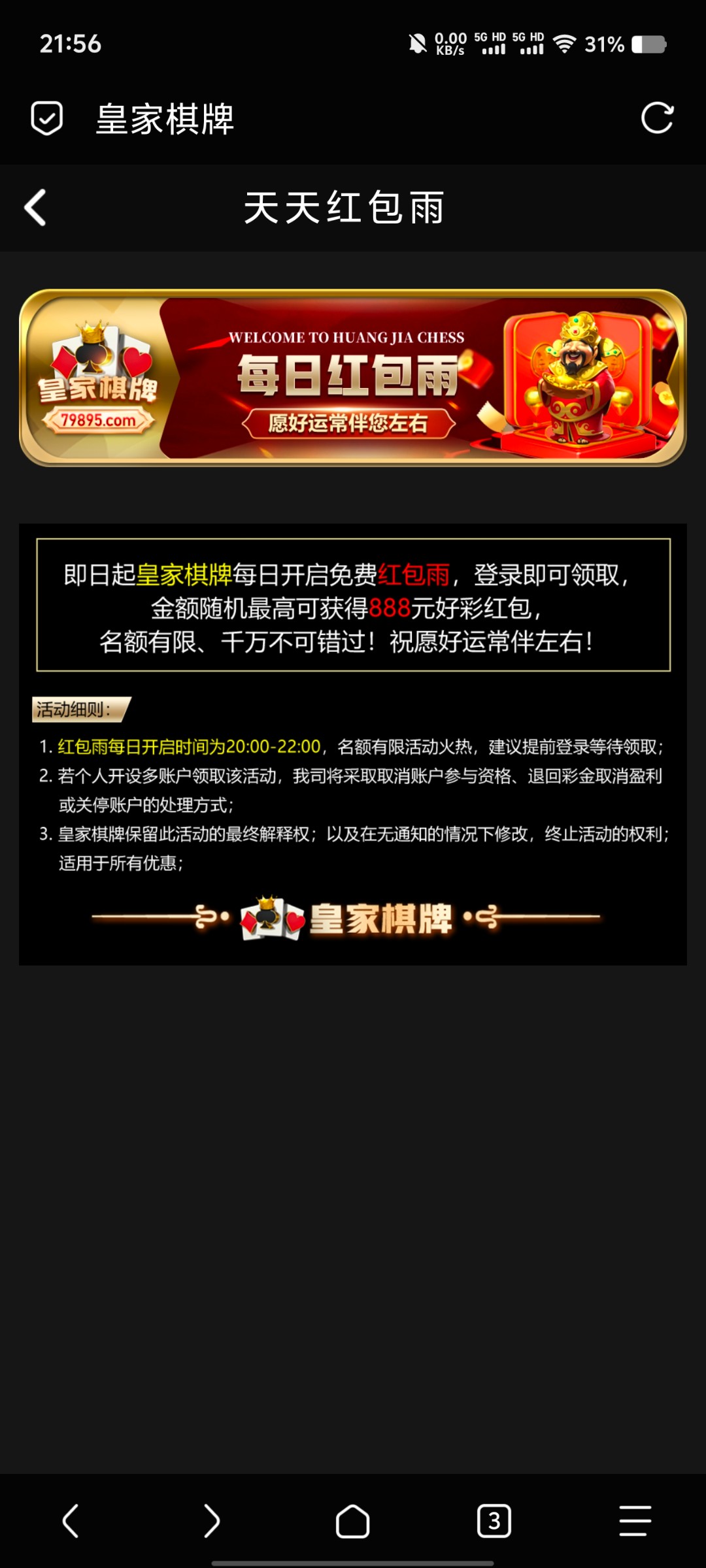 每天都有签到, 红包基本上都是0.5到10块的,老哥有实力可以去试试,每天可以签到,8点钟有红包,有时候没有弹出来,可以晚半个小时,和一个小时进去 地址 79895.com