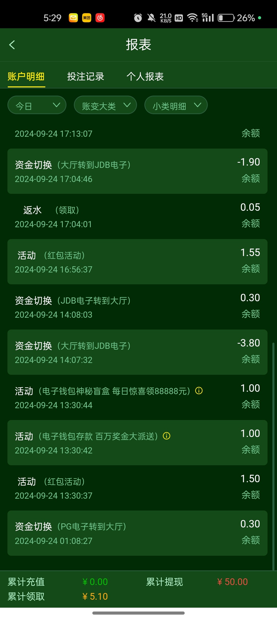 充值过差不多两万,一个红包一块钱,哎,153合并081这野鸡台我也是服了,以前的周月彩金都领不了,优惠还下架一堆