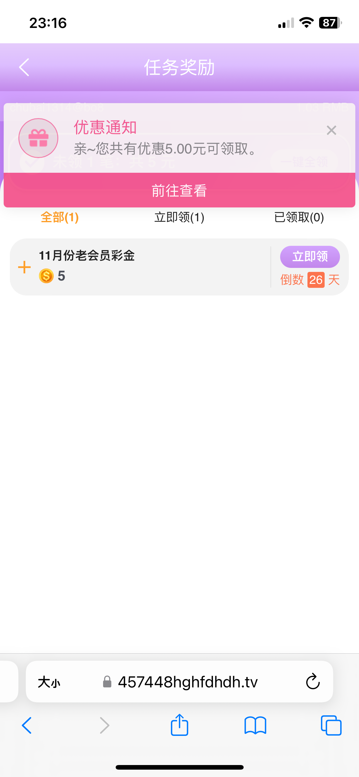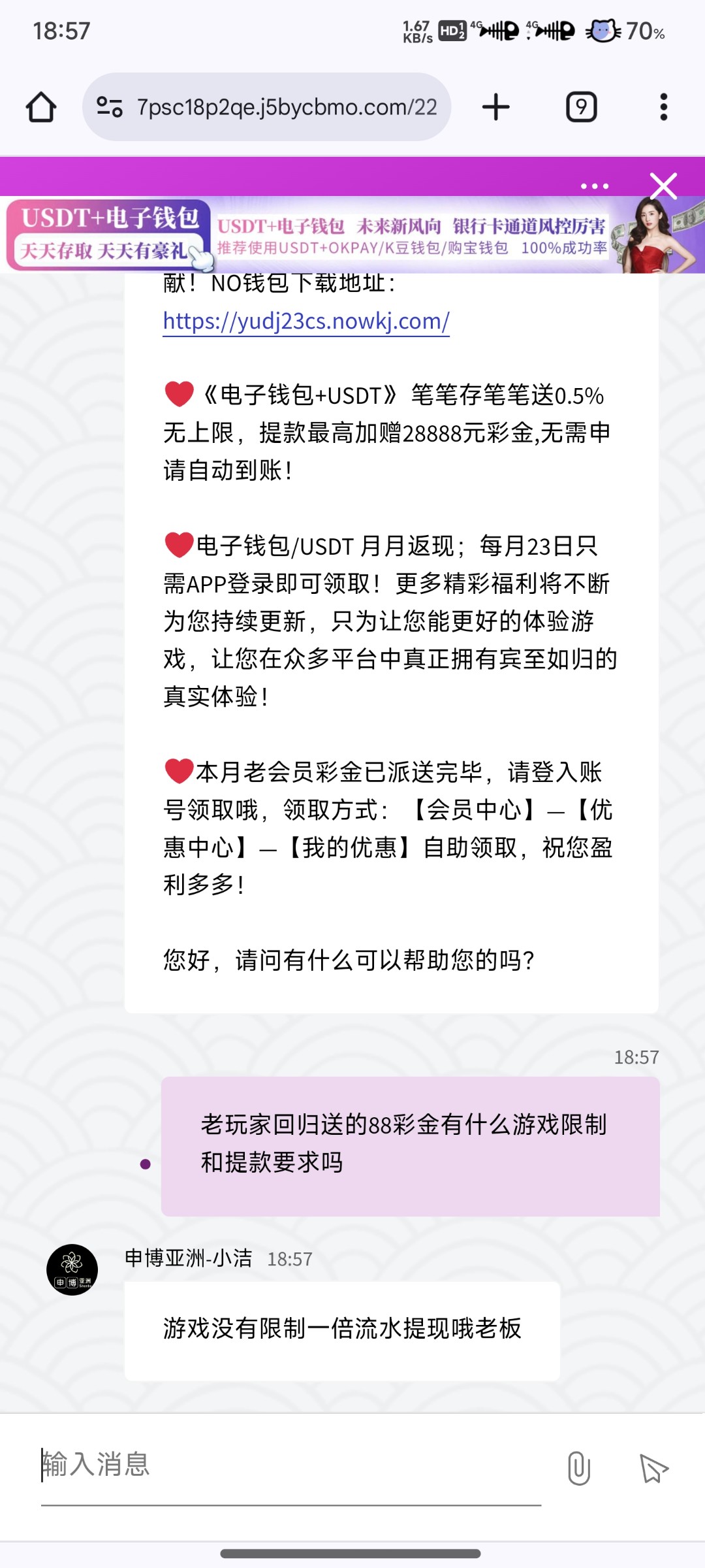 短信网址9208.cc 我登录的时候显示账号被锁定,找客服重置密码后登上了,领了88彩金。直接在首页可领优惠那里领的,我直接网页登录有点卡,不知道是不是老玩家都有还是收到短信才有,有号的去看下。