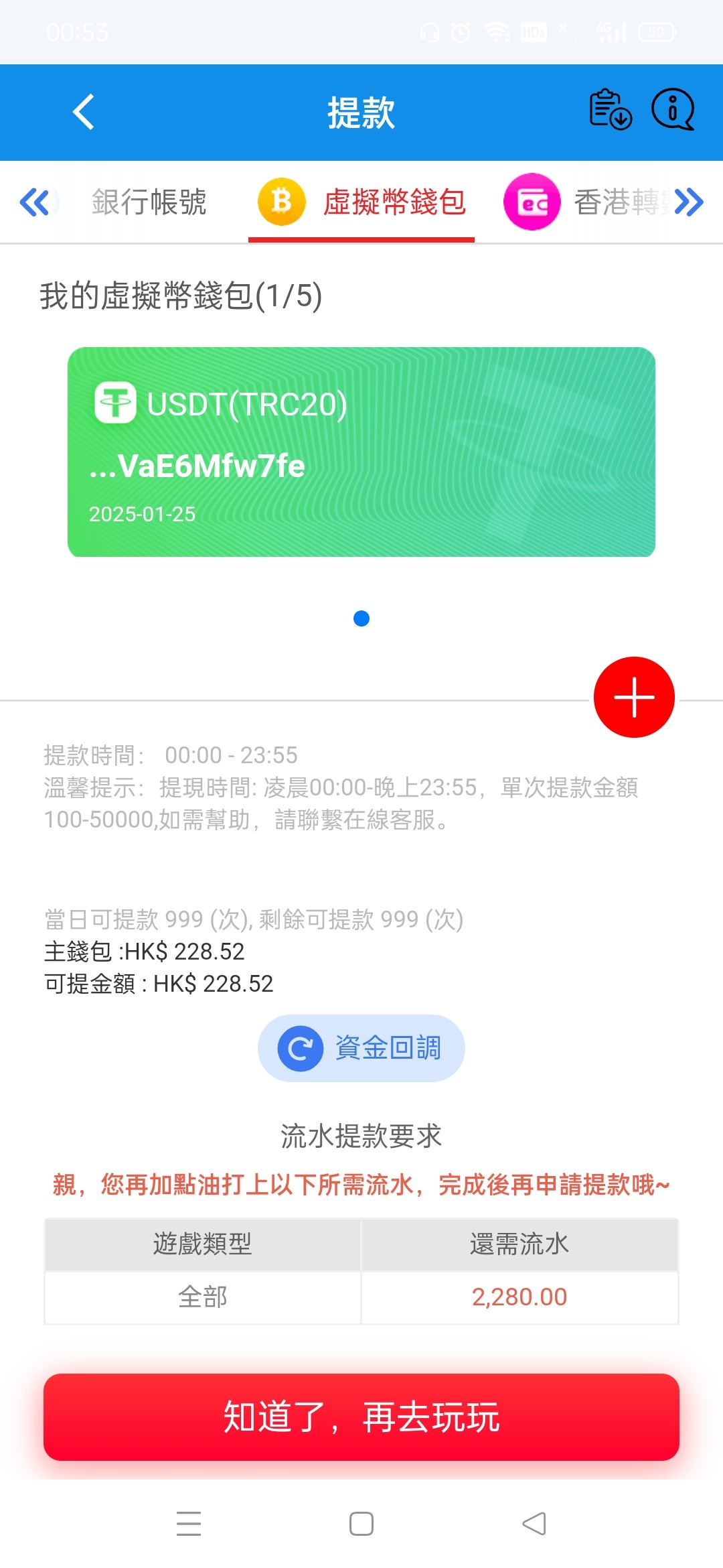 提现退回 罚流水2280