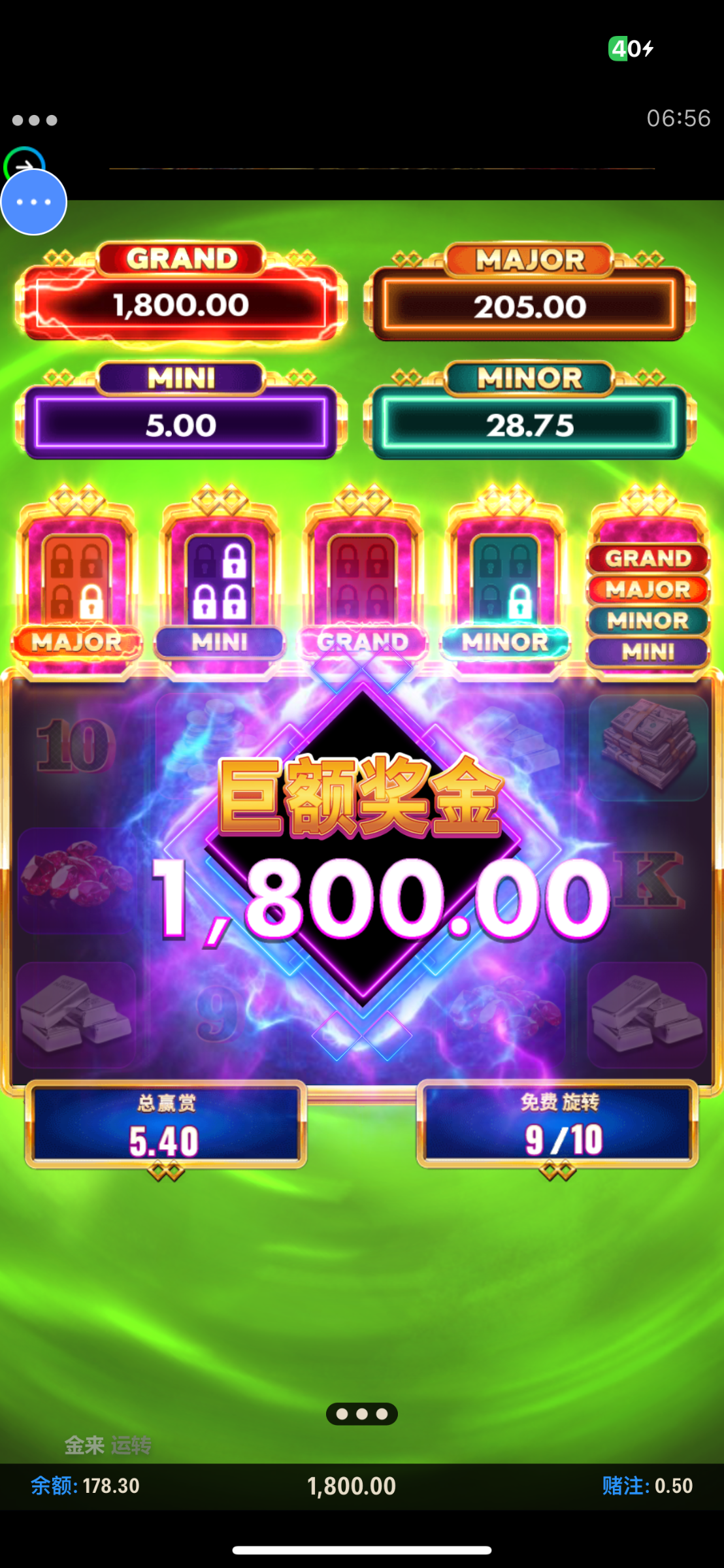 得吃了也是领了月亏损38彩金,磨了一晚上,一直在50左右,中间来了好几次大奖都差一点,以为也就这样了,想看看能刷多少水,结果直接爆了个最大的