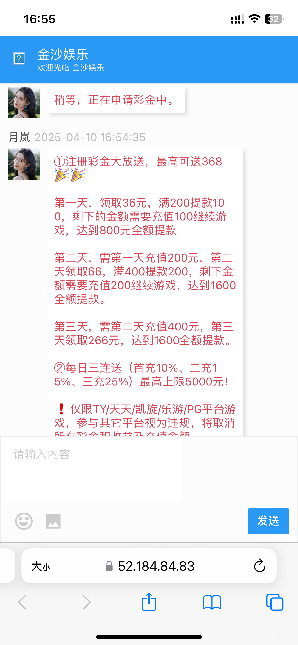 直接找客服说电话彩金 这个就是送30那个撸过的都有号我三个号都领到没查号码 提款不知道没打出来还有一个号没打PG维护了不知道什么时候维护好链接 5627.vip