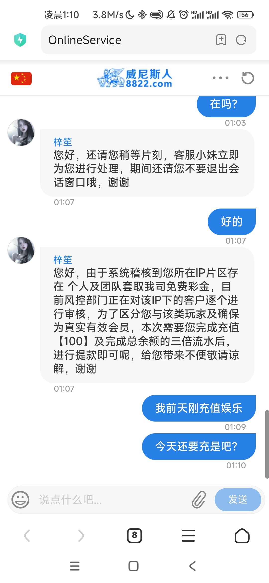 4.1号也就是今天 签到彩金有打上了100 还是跟那天说辞一模一样 充100加三倍水
