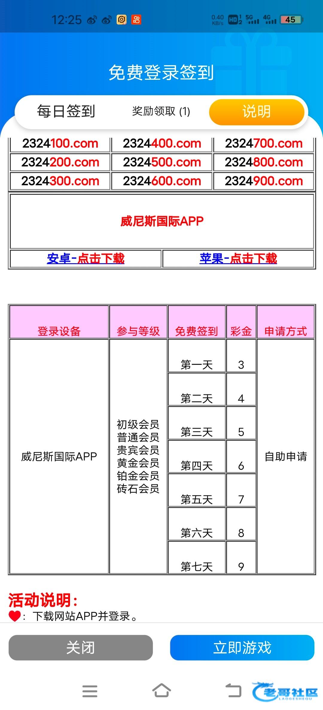 之前发过一次,但是之前签到金额是(2+2+3+3+3+6+6)=25,现在周一到周日连续7天的签到金额改成了(3+4+5+6+7+8+9)=42。之前玩过充值过符合下面图片上vip