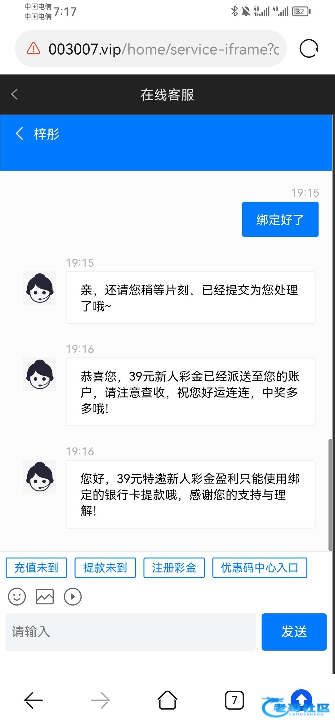 注册送39联系客服发手机号和ID,说申请电话彩金,需要绑定银行卡和邮箱,自测吧,请勿充值003007.vip
