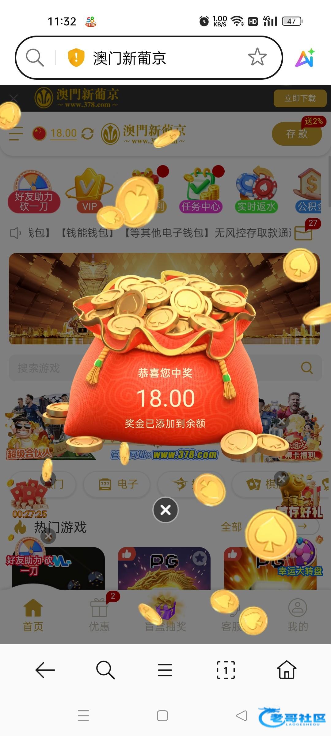 注册未充值领取过一个8,今天看到别人发的登陆有8和18不等的彩金,自己登上去送了28,提现140秒到,有号的登上去看下,没有无视就可以 378.com