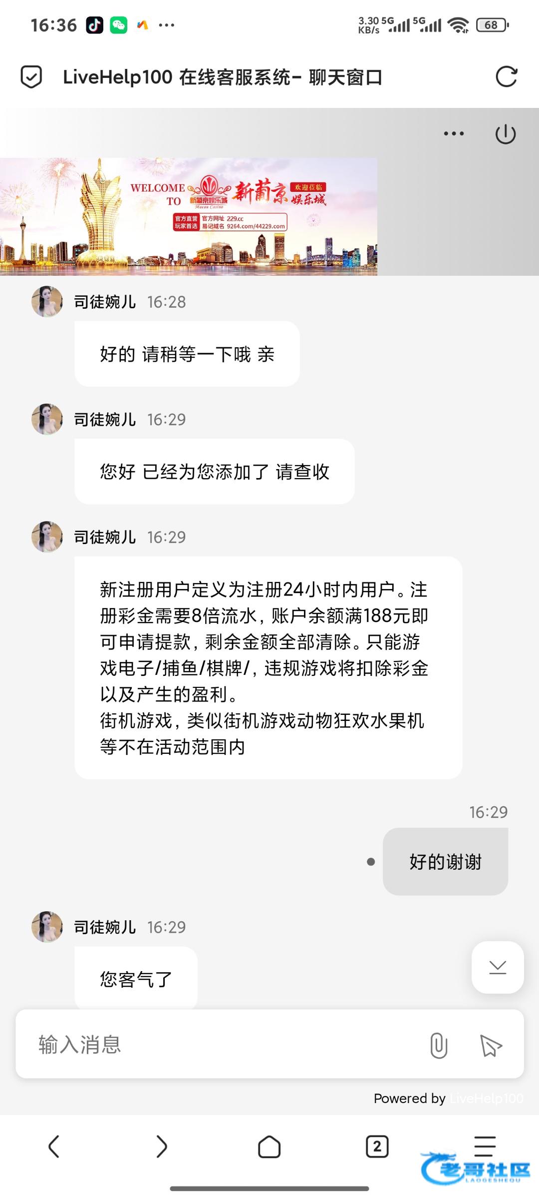 新葡京专属客服—晓晓14:39亲,很抱歉。目前注册彩金活动名额已满 建议您关注一下我们的充值30送38以小博大活动,无需流水 盈利至288即可提现 仅限游戏电子(街机电子、桌面电子游戏不参与)谢谢