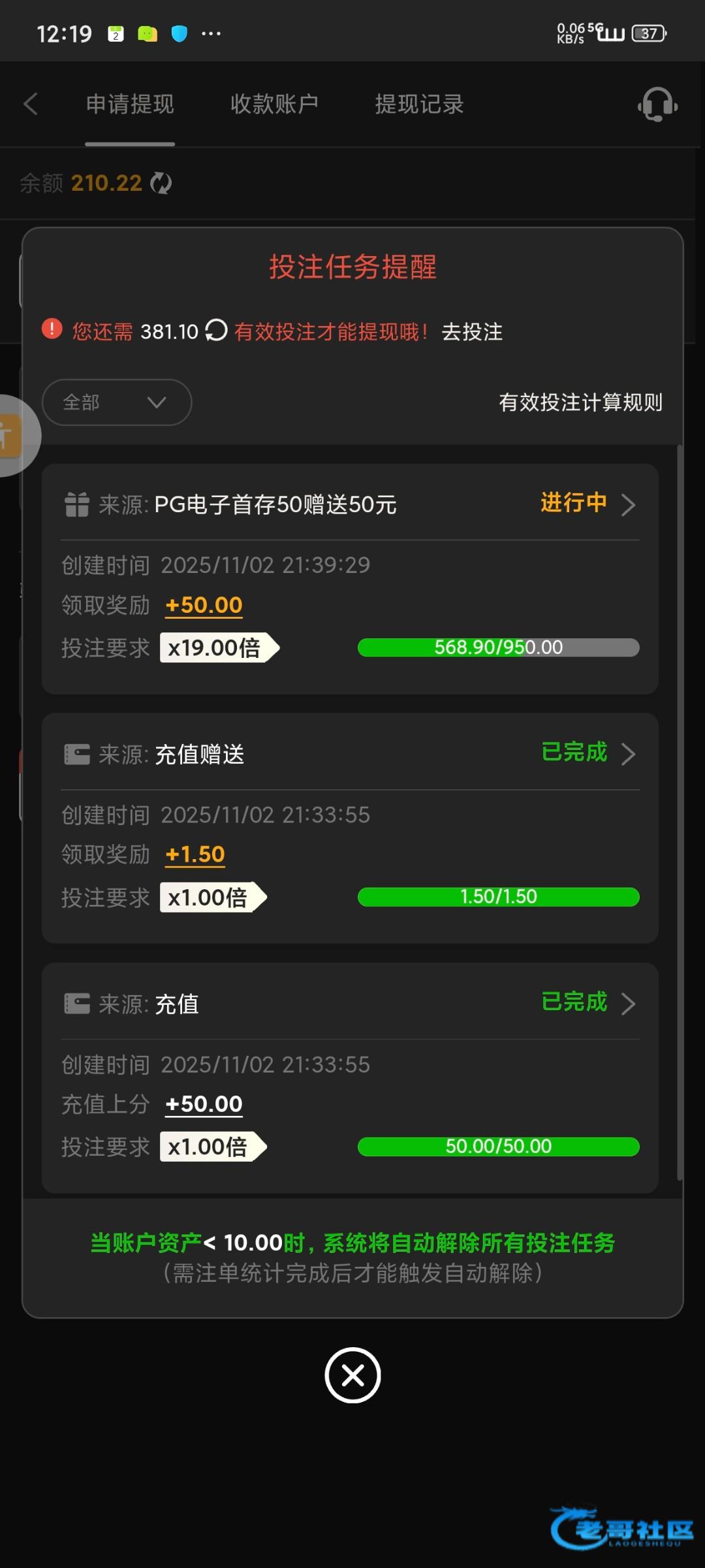 新玩家开户首存50送50彩金活动10倍打码可提款,流水够了余额有210不给提,问客服说要20倍流水才可以提,然后继续打流水挂壁了,本金都输完,真他妈的恶心